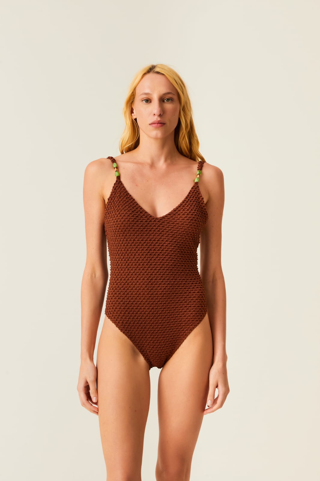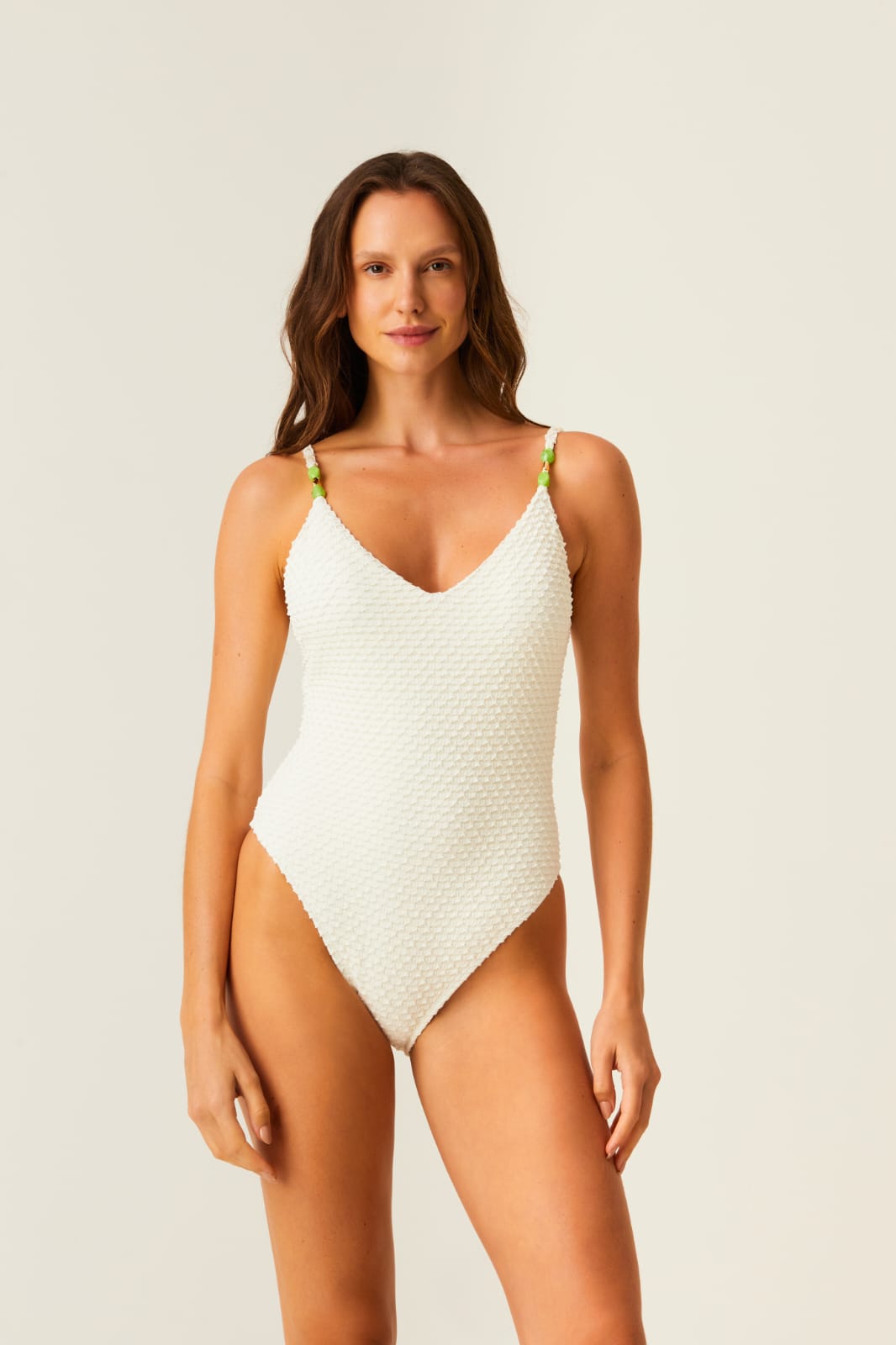 Malla con textura, detalles en pedreria y cuerdas, breteles regulables. Relleno soft.